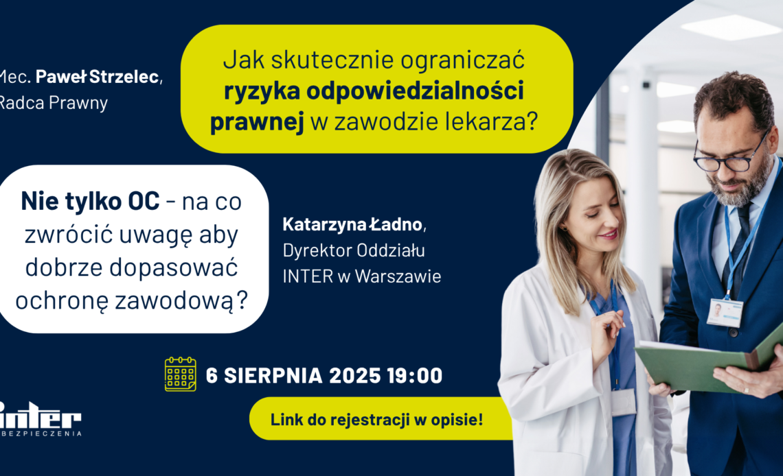 Ryzyko prawne i finansowe to dziś codzienność w pracy lekarza. Rosnąca liczba roszczeń pacjentów i dynamiczne zmiany w przepisach sprawiają, że właściwie dobrane ubezpieczenie staje się kluczowym elementem ochrony zawodowej. 6 sierpnia odbędzie się bezpłatny webinar, w którym prawnicy i specjaliści INTER Polska wyjaśnią, jak minimalizować zagrożenia w praktyce medycznej.