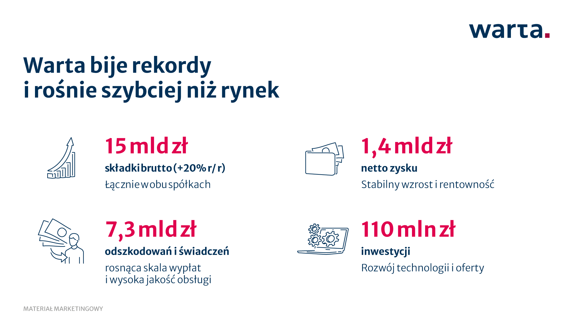 W 2025 roku Grupa Warta osiągnęła wyniki, które wyraźnie wyróżniają ją na tle rynku. Składka brutto przekroczyła 15 mld zł, a dynamika wzrostu znacząco przewyższyła tempo obserwowane w sektorze. Jednocześnie spółki utrzymały wysoką rentowność i wypłaciły miliardy złotych odszkodowań oraz świadczeń.